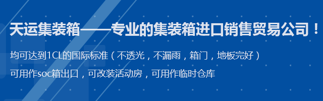 青島天運(yùn)集裝箱服務(wù)有限公司,是專業(yè)的集裝箱進(jìn)口銷售貿(mào)易公司,公司與各大船公司租箱公司保持著密切的合作關(guān)系,箱源充足,所有出售集裝箱均可達(dá)到IICL的國際標(biāo)準(zhǔn)(不透光,不漏雨,箱門,地板完好)可用作soc箱出口,可改裝活動房,可用作臨時(shí)倉庫。
